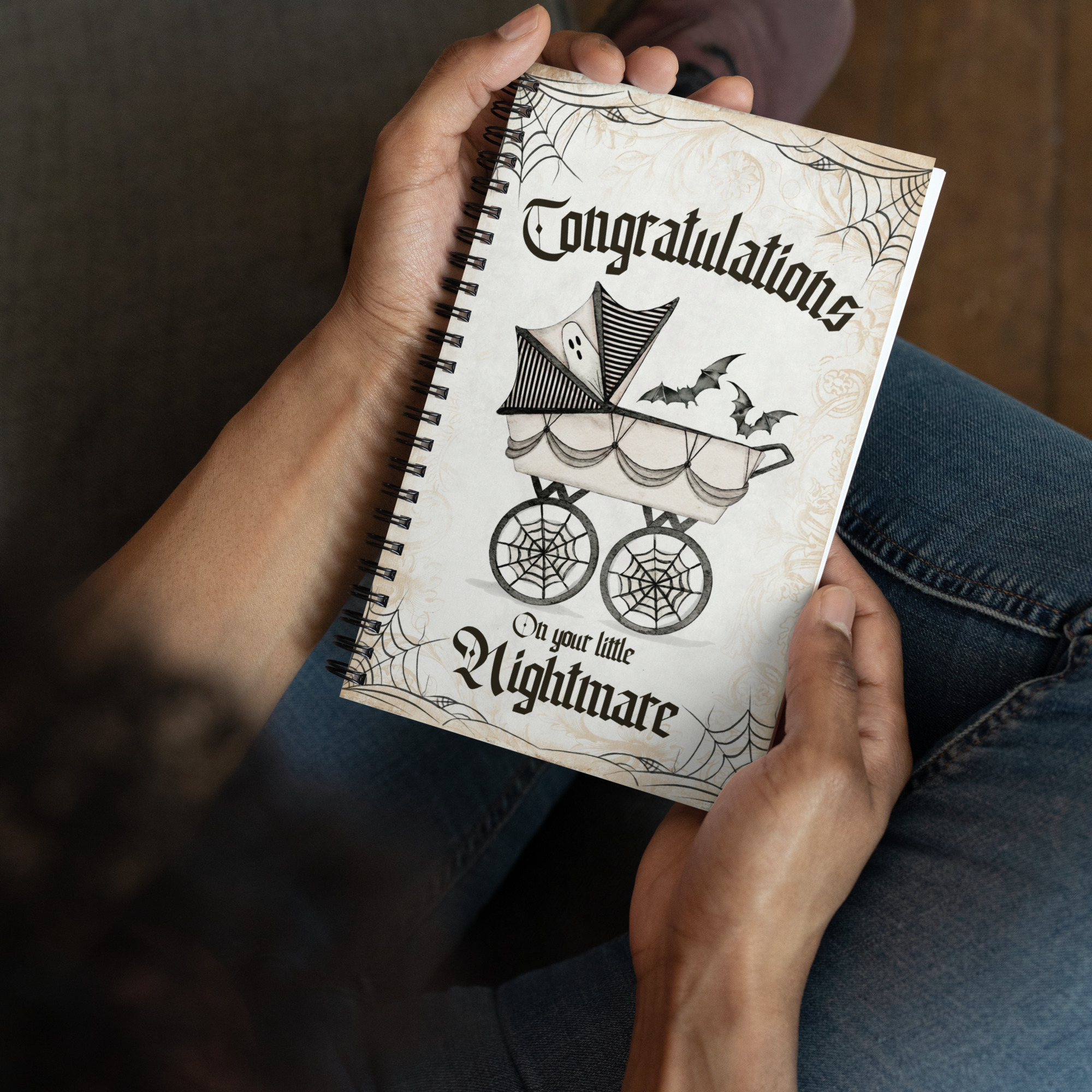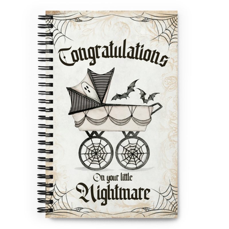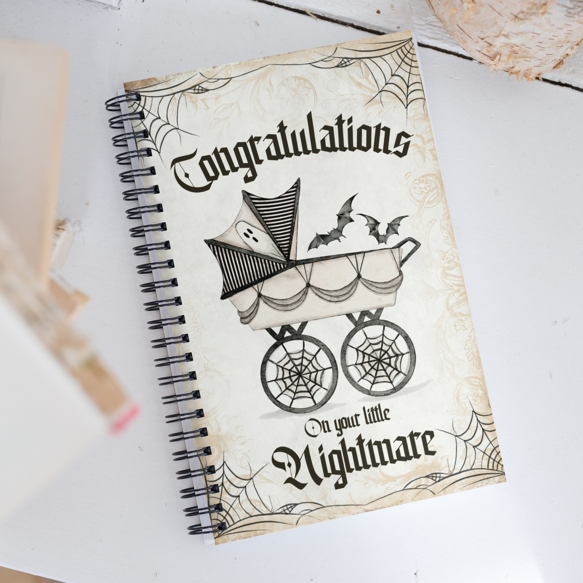 Fantastisk skrivbok med 140 tomma sidor att fylla med dina innersta tankar och idéer. På framsidan återfinns ett gotiskt motiv med en barnvagn och texten ’Congratulations on your little nightmare’. Tillverkad i kraftigt papper med en höjd på 21 cm. Skrivboken passar perfekt som present till de nyblivna föräldrarna eller som gästbok på en baby shower.