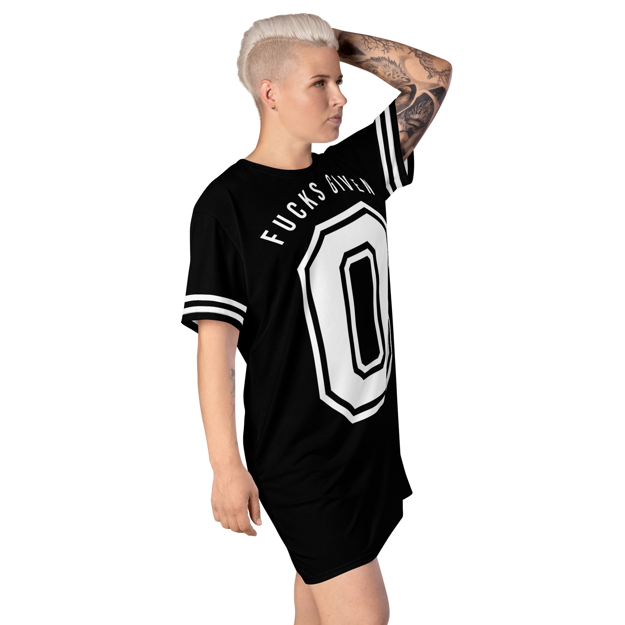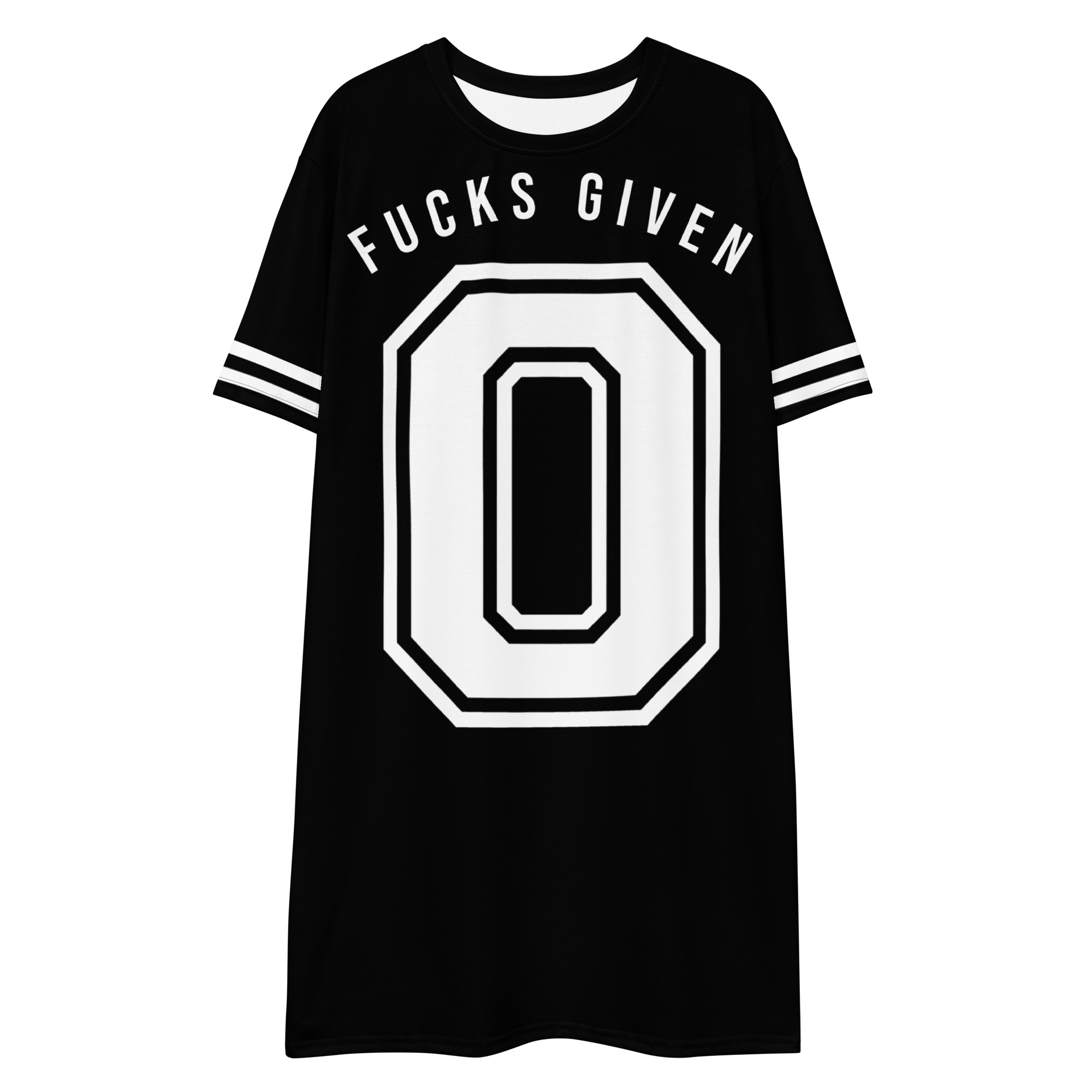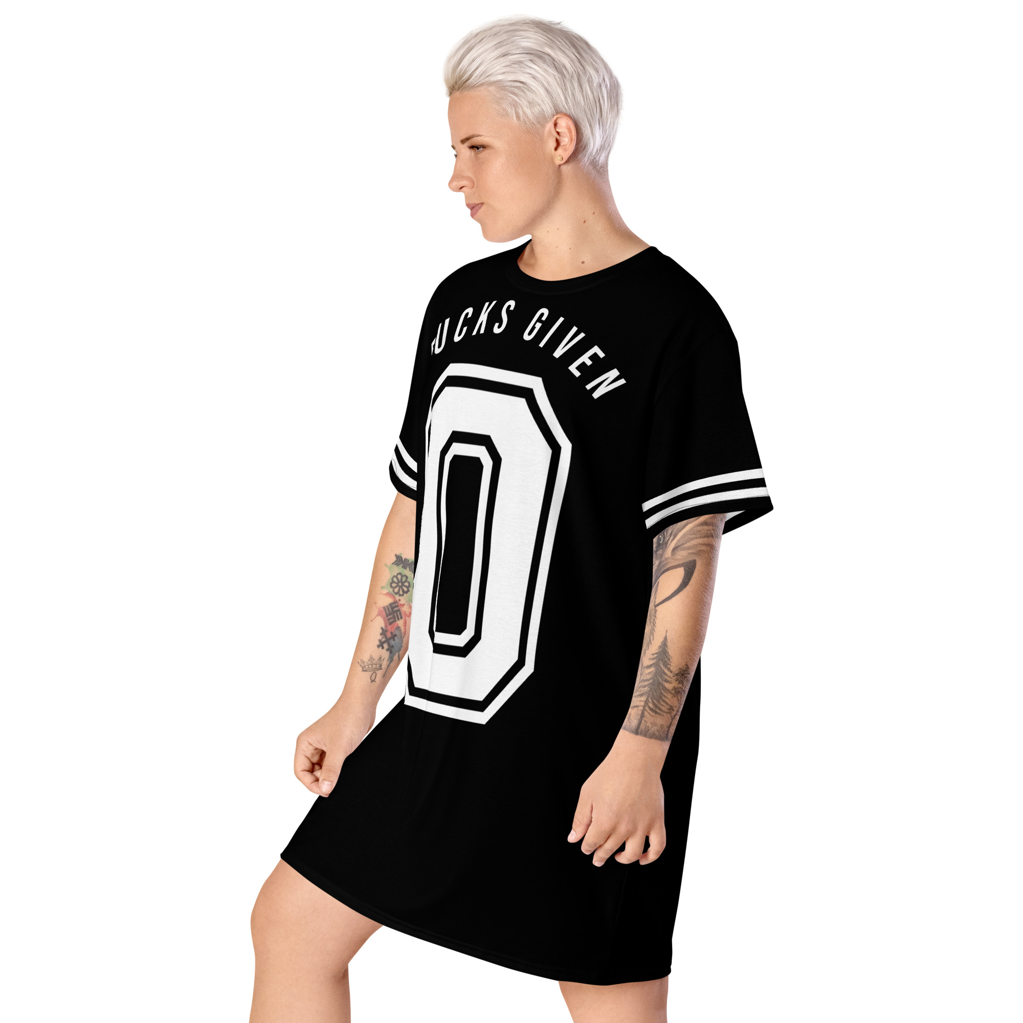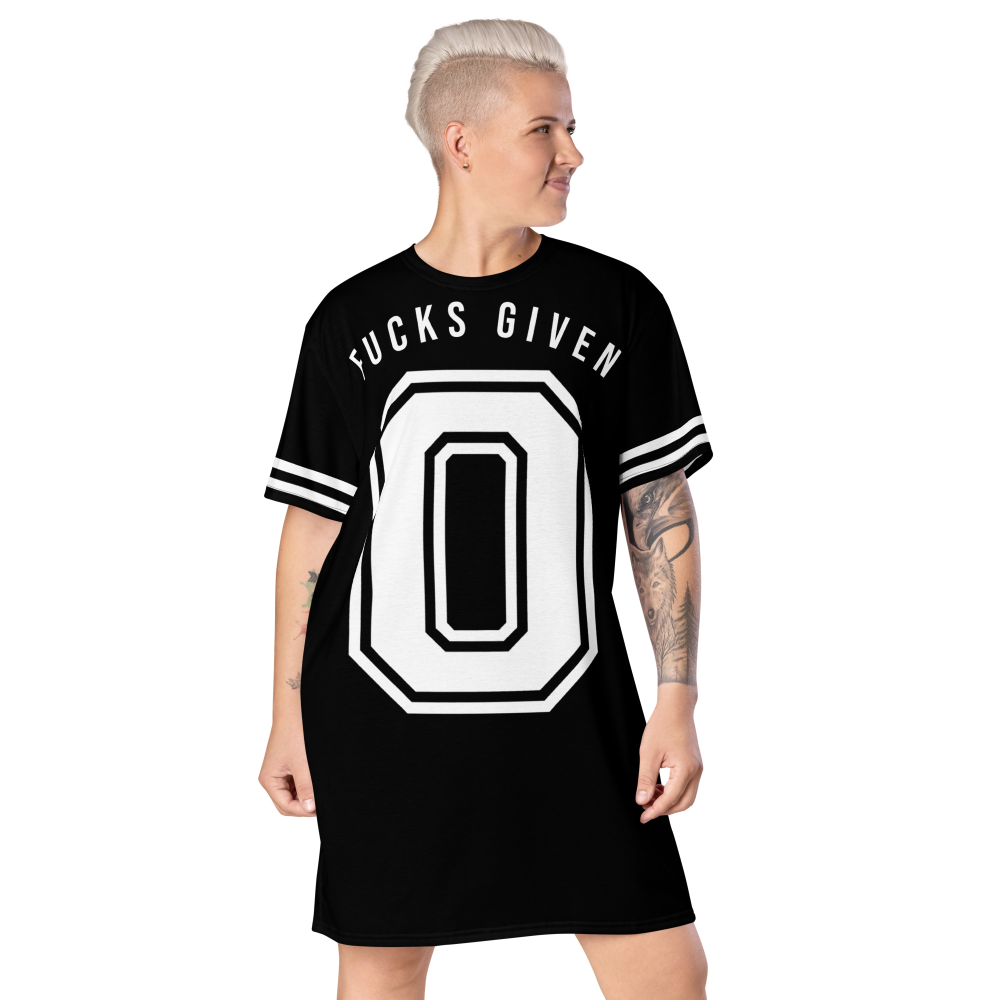 Underbar klänning i en skön oversize t-shirt-modell. Klänningen är dekorerad med budskapet ’Zero fucks given’ som tryck på framsidan. Tillverkad i polyester och spandex som gör klänningen otroligt mjuk och skön. Kommer garanterat dra blickarna till sig.