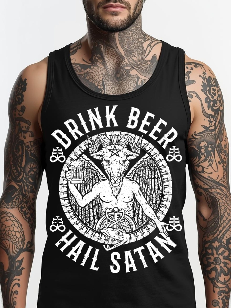 Svart linne i unisex-modell med Baphomet som dricker öl och texten ’Drink beer, hail Satan’ som tryck på framsidan. Tillverkad i en fin kvalitet i 100% bomull och passar perfekt till både män och kvinnor.