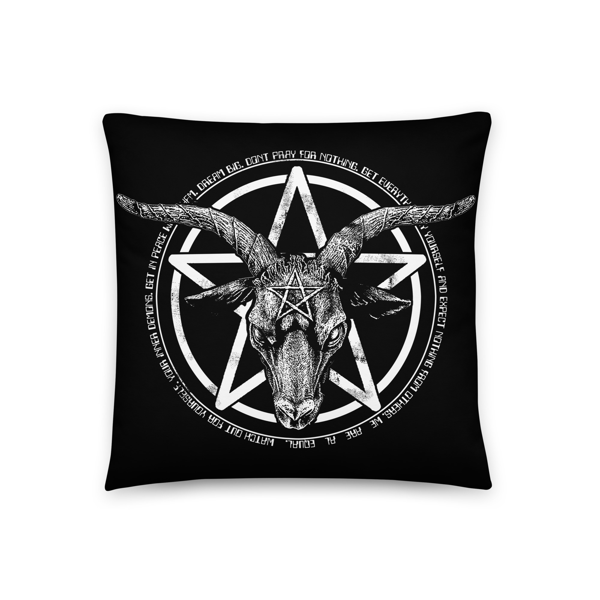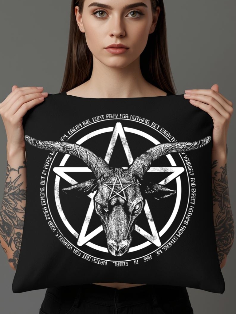 Riktigt snygg prydnadskudde med ett pentagram och Baphomet som dekoration. Kudden är 45×45 cm och har tryck på båda sidorna. Tillverkad i polyester i en fin kvalitet. Överdraget kan tvättas i maskin och innehållet kan tvättas för hand. Kudden har en gömd dragkedja så överdraget lätt kan tas av.
