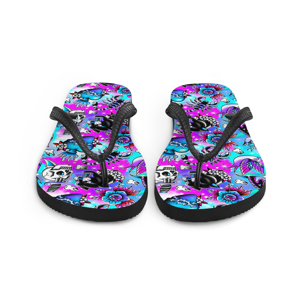 Snygga flip-floptofflor dekorerade med pastellfärgade tatueringsmotiv i old school-stil som tryck. Tillverkade i 100% polyester med en sula i slitstark gummi. Välj mellan tre olika storlekar, se storleksguiden för att hitta din storlek.