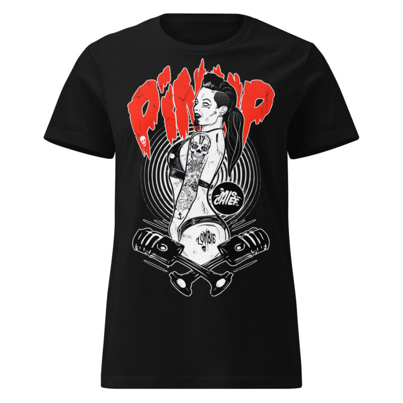 Denna unika t-shirt med smal passform är designad för den som vill sticka ut från mängden med en touch av skräckblandad förtjusning. Framsidan pryds av en iögonfallande illustration av en zombiepinuppa, som kombinerar klassisk pinupstil med en makaber twist. Passar perfekt till kvinnor och är tillverkad i en supermjuk kvalitet i 100% bomull.